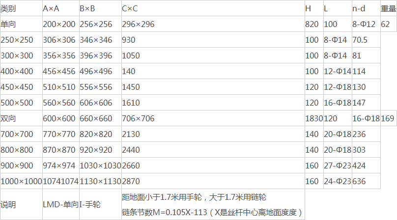 主要由框架、閘板、絲桿、螺母等零件構(gòu)成,用手轉(zhuǎn)動(dòng)手輪使絲桿帶著絲桿螺母和閘板沿水平方向往復(fù)運(yùn)動(dòng),達(dá)到閘門(mén)的啟閉目的。